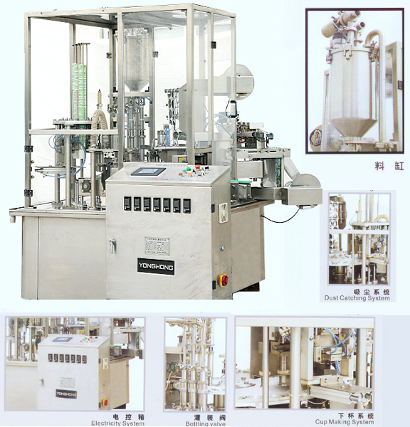 本機器是專為紙杯、塑料杯而設(shè)計的灌裝封口機,集機械手下杯、頂杯灌裝、制蓋、封口、卷邊等為一體的自動化設(shè)備,可灌裝果粒,采用進口氣動原件,人機界面控制,具有占地面積小、自動化程度高等優(yōu)點。